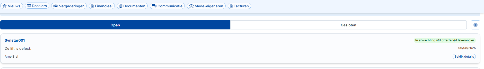 Naast de tabbladen "Open" en "Gesloten" staat een "+" knop. Deze kan door de mede-eigenaren worden gebruikt om een melding te maken. De volgende informatie moet worden ingevuld: