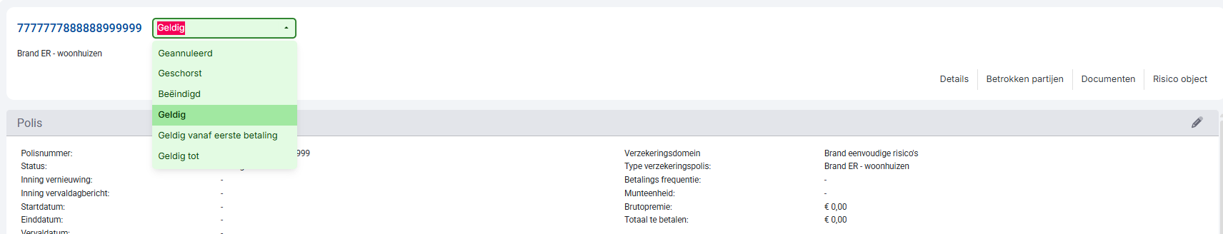 In de details van de polis kan er gecontroleerd worden of de polis nog loopt, wat de polis dekt, informatie gewijzigd worden, documenten toegevoegd worden en/of partijen gekoppeld worden.