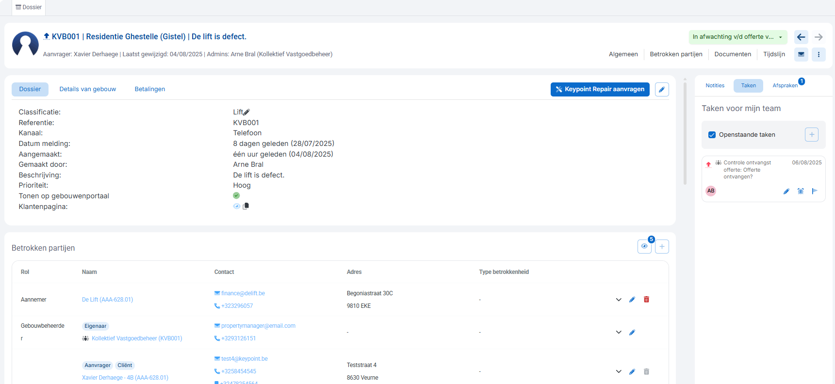 Het dossier wordt beheerd door taken in te stellen met vervaldatums, terug te vinden aan de rechterzijde van het scherm. Hier kunnen ook notities aan het dossier worden toegevoegd en afspraken worden geregistreerd. Via de mailknop is toegang mogelijk tot alle inkomende en uitgaande e-mailcommunicatie met betrekking tot het dossier.