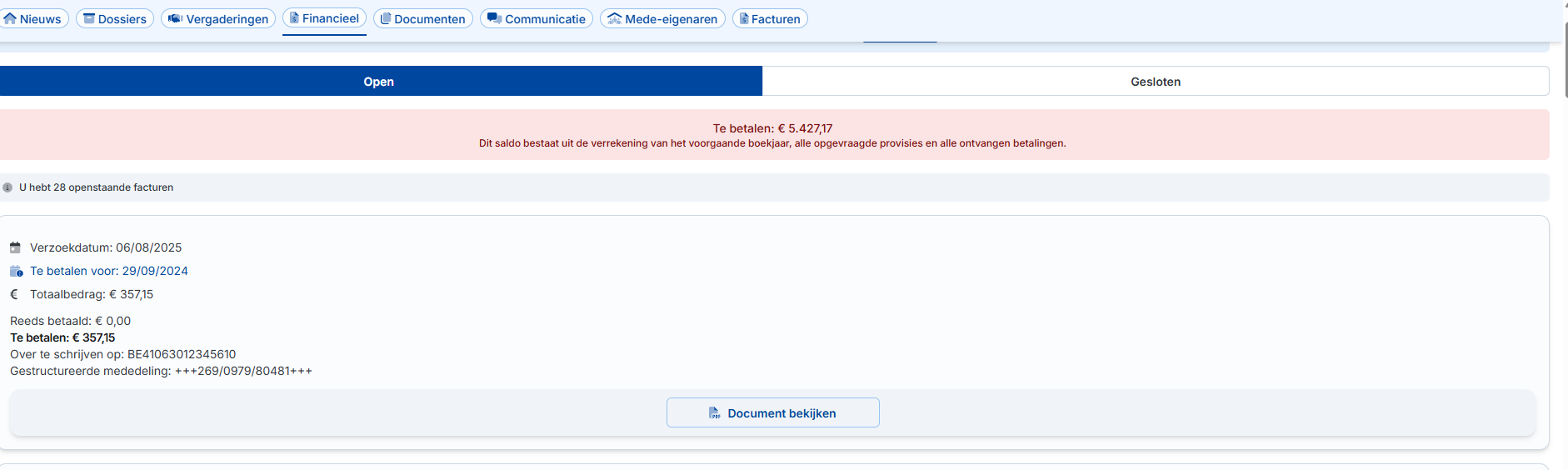 Deze pagina kan bekeken worden door te navigeren naar het menu "Financieel" in de navigatie bovenaan de pagina. Op deze pagina kunnen de eigenaren alle provisies zien die betaald moeten worden of die al betaald zijn.