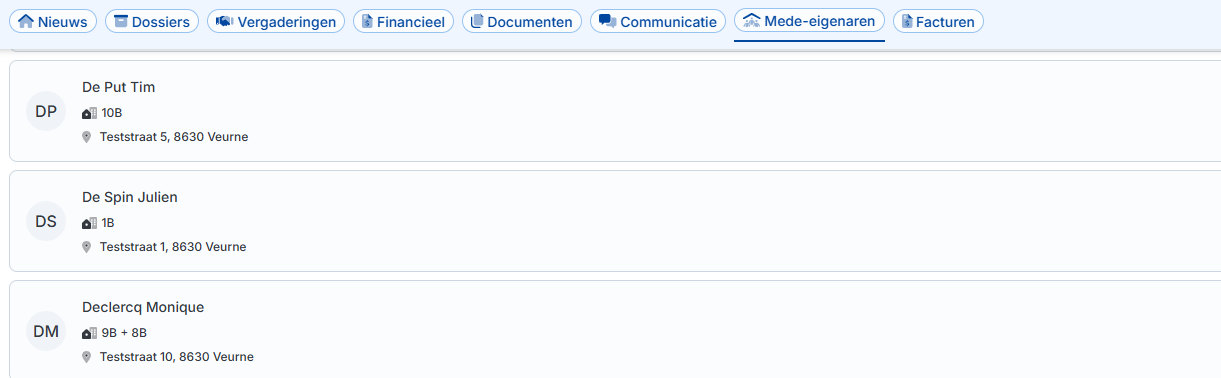 Deze pagina kan bekeken worden door te navigeren naar het menu "Mede-eigenaren" in de navigatie bovenaan de pagina. Op deze pagina kunnen de eigenaren een lijst zien van alle andere eigenaren die binnen de VME wonen.