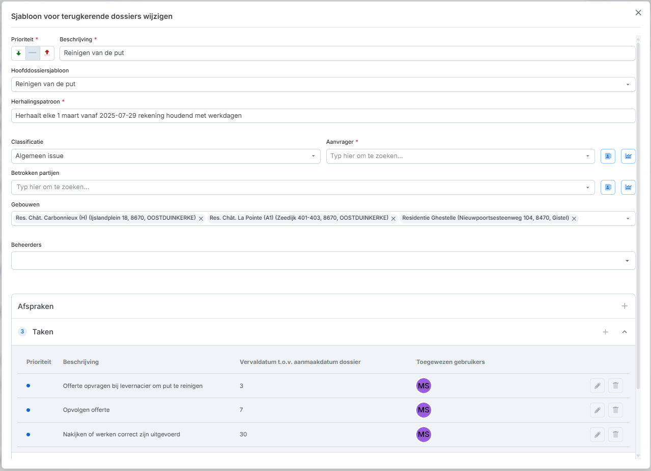 - Ga naar de sectie "sjablonen voor terugkerende dossiers" en klik op de "+" knop om een sjabloon te maken: