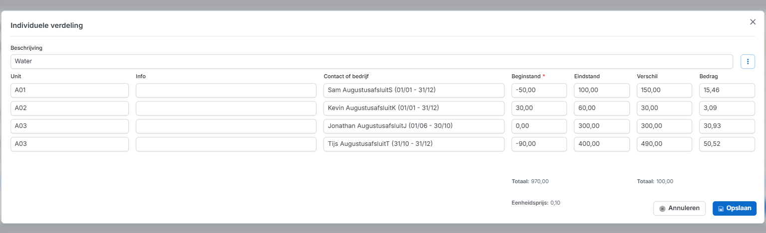 Om de verdeling te maken tussen de mede-eigenaars, klik op de "..." knop aan de rechterkant. Dit voegt automatisch een regel toe voor alle wooneenheden en de bijbehorende contacten.