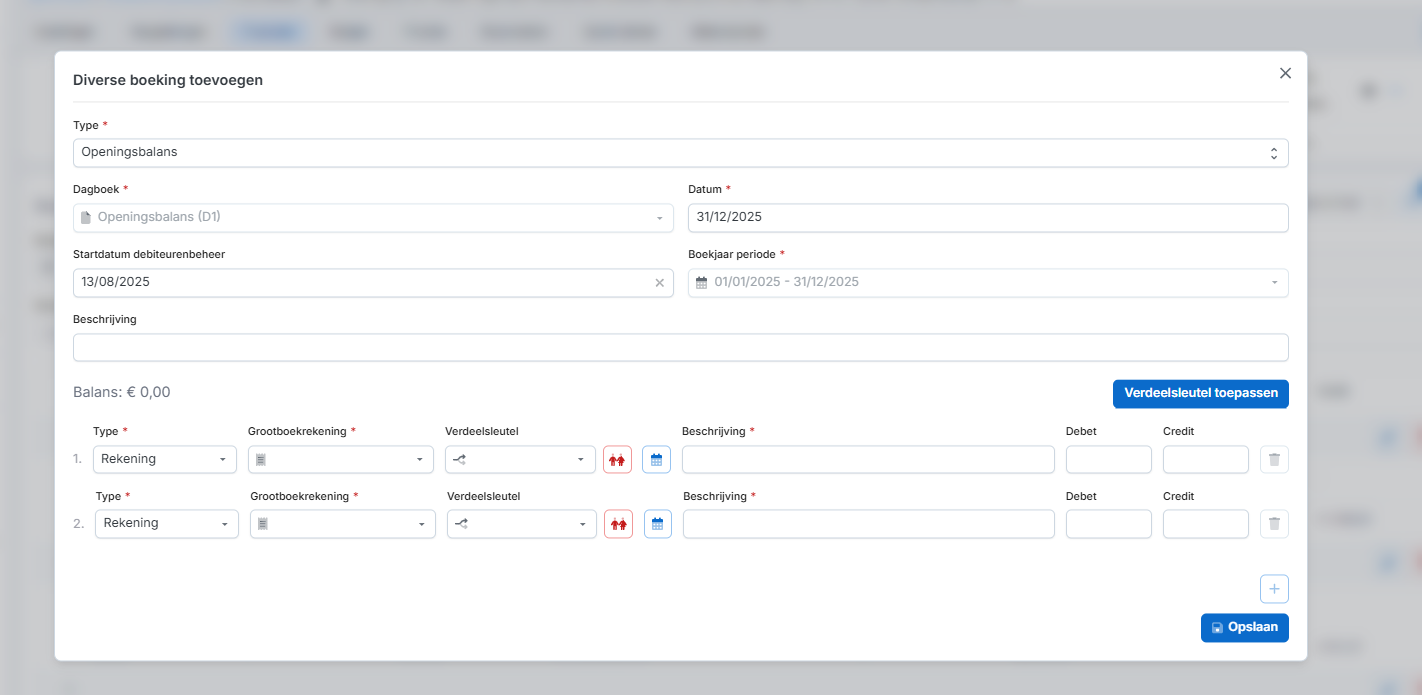 Wanneer de volledige openingsbalans is ingevuld en debet/credit in balans is, klik dan op "Opslaan".