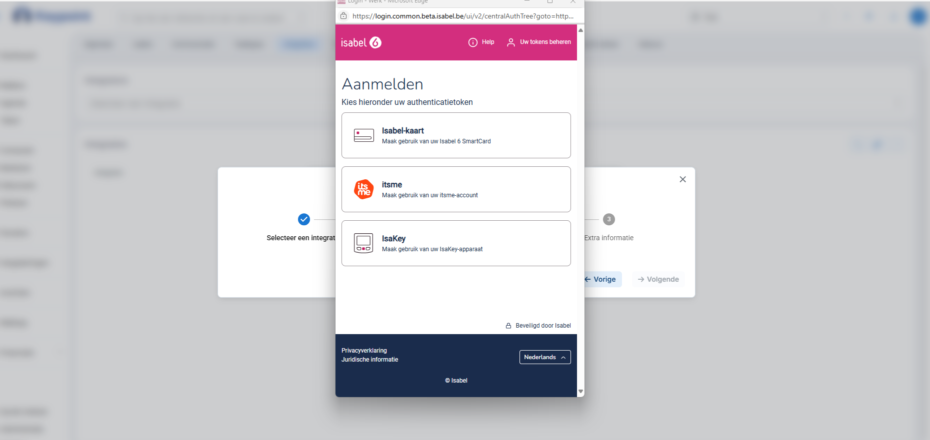 Er wordt een pop-up geopend. Selecteer de verificatiemethode: "IsaKey", "Itsme" of "Isabel-kaart".