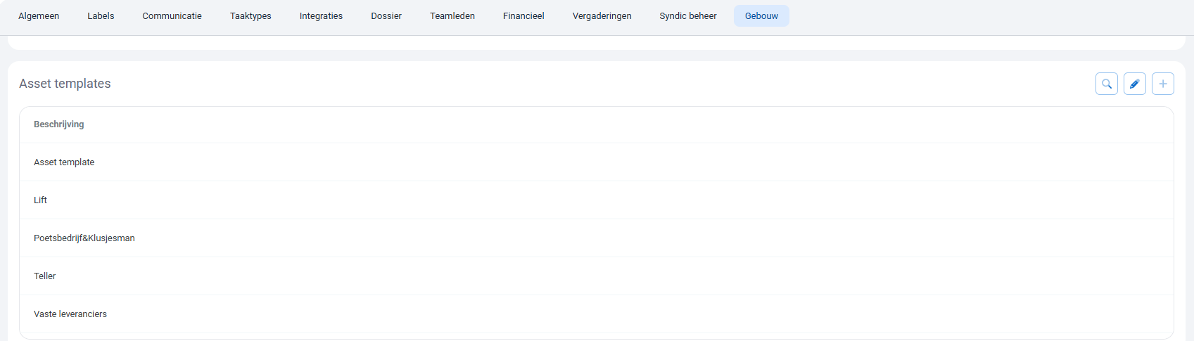 Met behulp van assetsjablonen kan er belangrijke informatie opgeslagen worden op de detailpagina van een gebouw. Voordat de sjablonen kunnen gebruikt worden, moeten ze eerst aangemaakt worden.