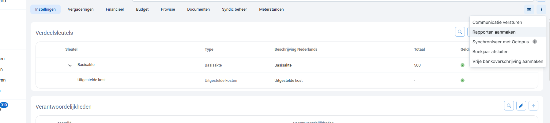Om de afrekening te verkrijgen, druk op de "..." knop binnen VME beheer en selecteer "Rapporten aanmaken".