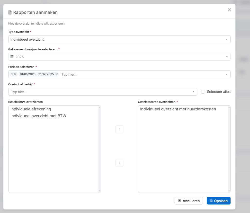 - Verplaats via de pijltjes "Individueel overzicht met huurderskosten" naar de rechtertabel.