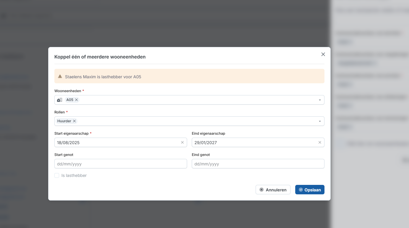 - Selecteer de juiste wooneenheid en selecteer "Huurder" bij "Rollen".