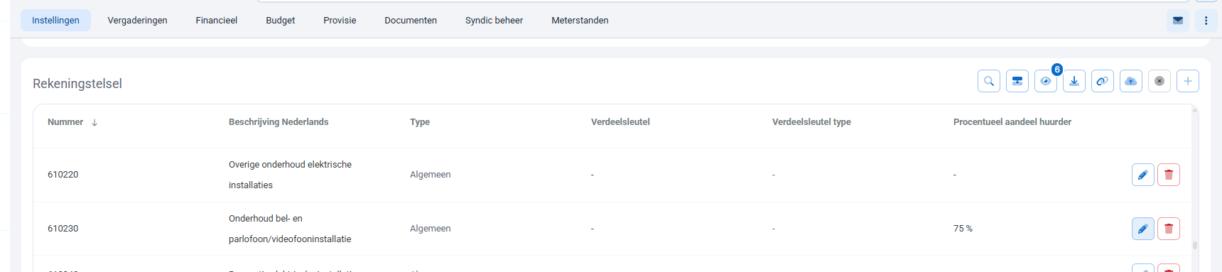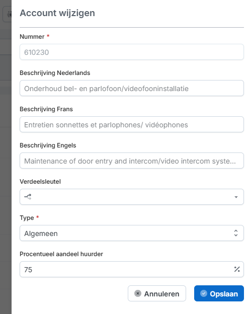 Het percentage dat hier ingevuld wordt, bepaalt het aandeel dat de huurder heeft in de kosten die worden geboekt op de specifieke rekening.