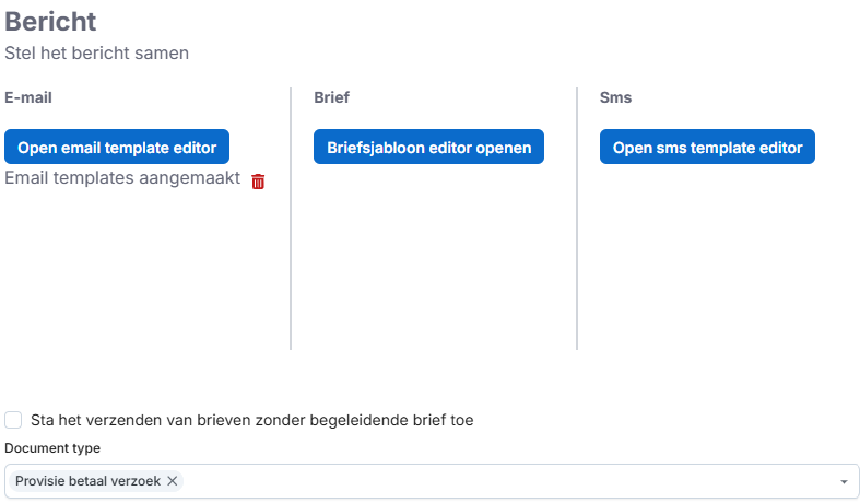 - Aanmaken van een automatisch bericht voor het geval dat het maximumbedrag wordt overschreden. Op deze manier wordt de mede-eigenaar ervan op de hoogte gebracht dat de opvraging via overschrijving zal verlopen. Stel dit bericht samen naar eigen wens. Vergeet niet het document type "Provisie betaal verzoek" toe te voegen.