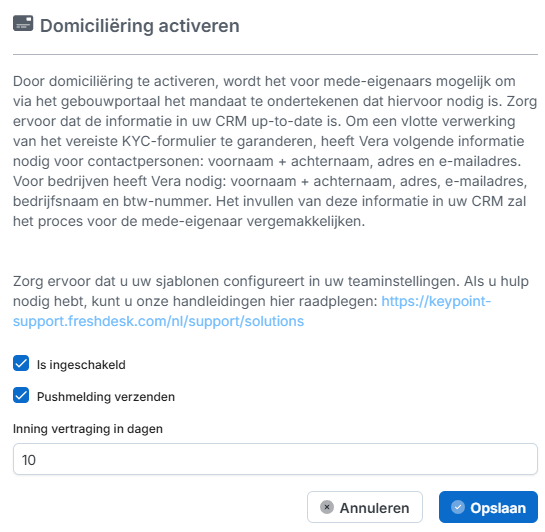 - Aangezien de mede-eigenaars hun domiciliëring zelf kunnen activeren via het mede-eigenaarsportaal, is het mogelijk om hiervoor een pushmelding te verzenden dat dit vanaf heden mogelijk is.