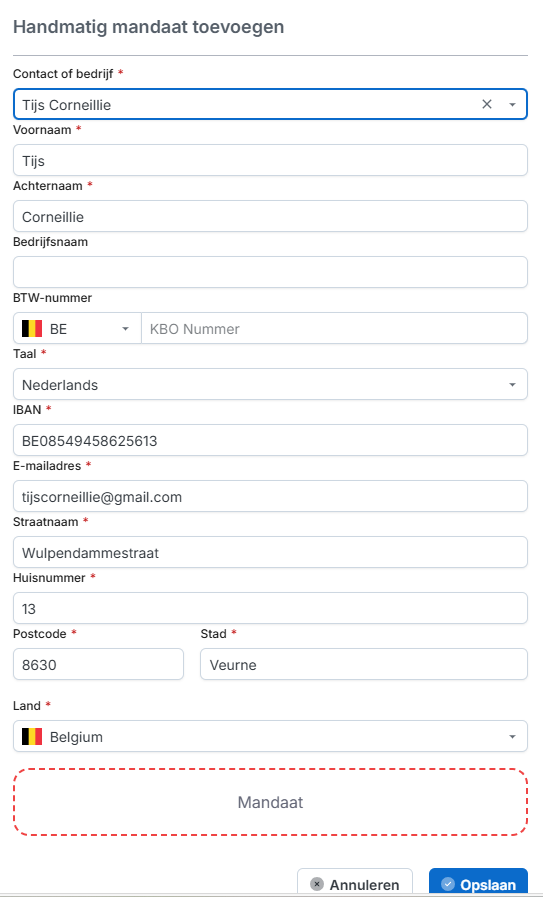 - Druk op "Mandaat" en upload hier het getekende mandaat. Druk op "Opslaan" en de domiciliëring is geactiveerd.
