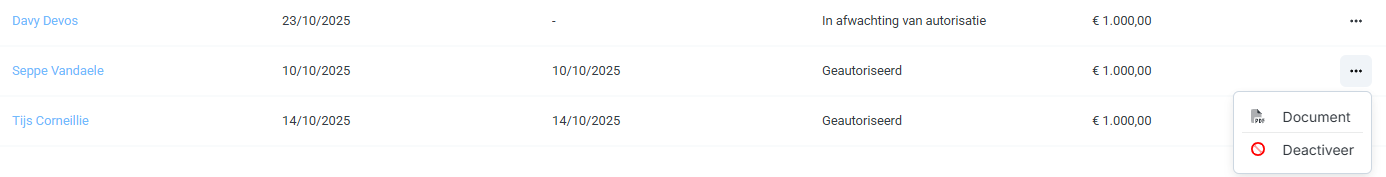 In het VME beheer onder het tabblad "Domiciliëring" kan de status van de mandaten teruggevonden worden. Eens deze in de status "Geautoriseerd" komen te staan, betekent dit dat ze finaal zijn goedgekeurd. Klik op de "..." knop om het domiciliëringsmandaat te openen of om deze te deactiveren.