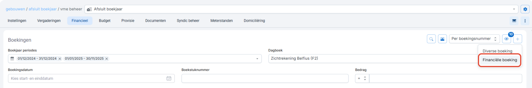 Om banktransacties manueel in te voegen, kan u terecht in het VME beheer onder het tabblad financieel -> boekingen. Via het plusje kan u een financiële boeking toevoegen.