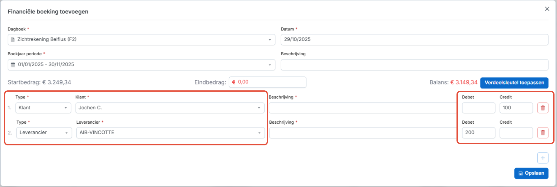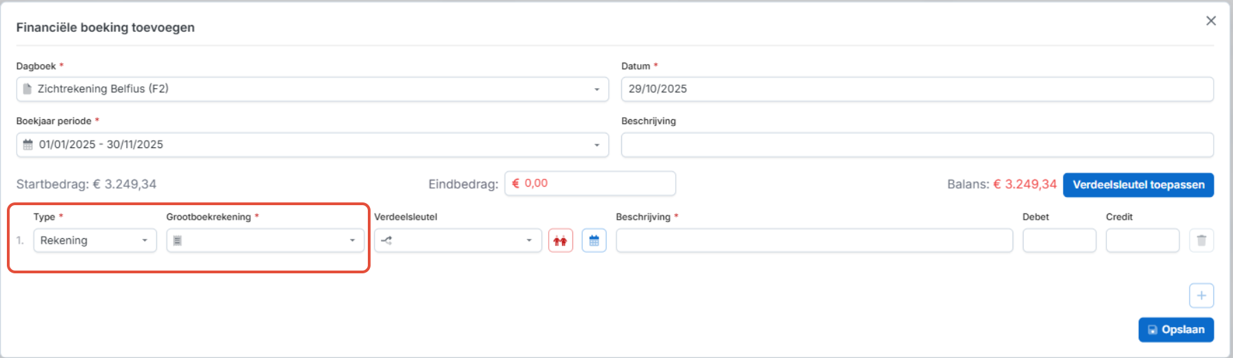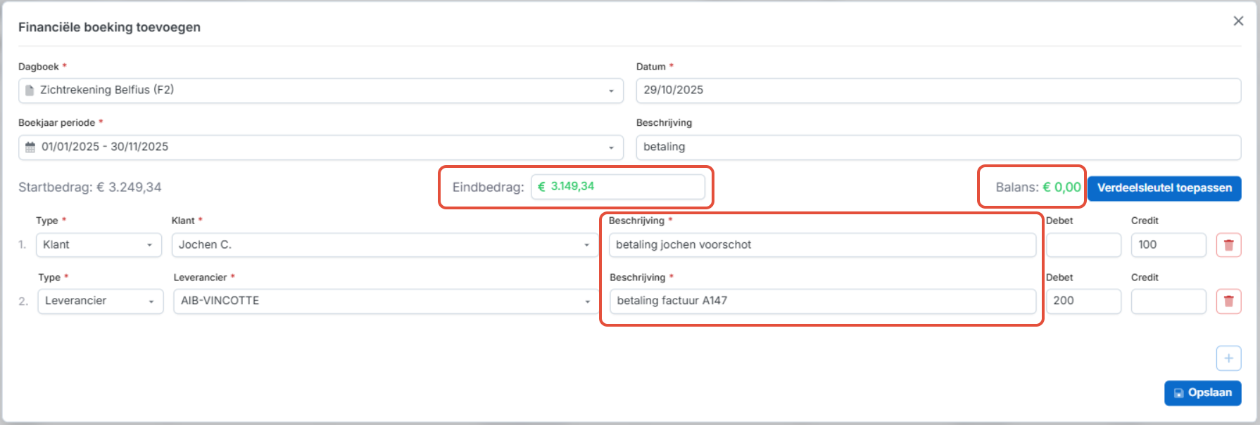 Vul de algemene beschrijving in of vul een beschrijving in per lijn in de boeking en kopieer vervolgens het bedrag bij balans naar eindbedrag. Het is de bedoeling dat het bedrag bij balans op nul komt te staan, dit dient als controlemiddel om na te kijken of dit overeenkomt met het eindsaldo op uw uittreksel. Indien dit niet op nul staat, zal u de boeking niet kunnen opslaan.