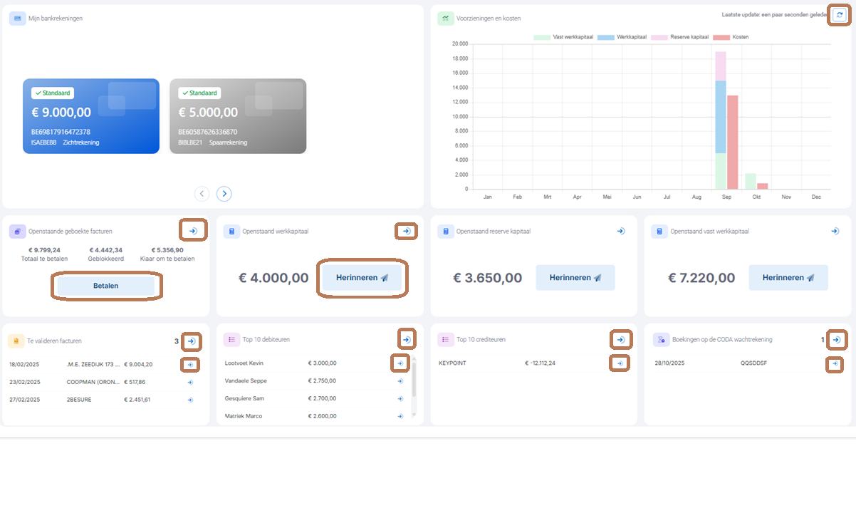 Een grafisch overzicht van de reeds gedane opvragen en de kosten van de VME. Bepaal op basis hiervan of er extra provisie opvragingen noodzakelijk zijn. Om een up-to-date overzicht te hebben, klik steeds rechtsboven op de refresh knop om de laatste versie van deze grafiek te zien te krijgen.