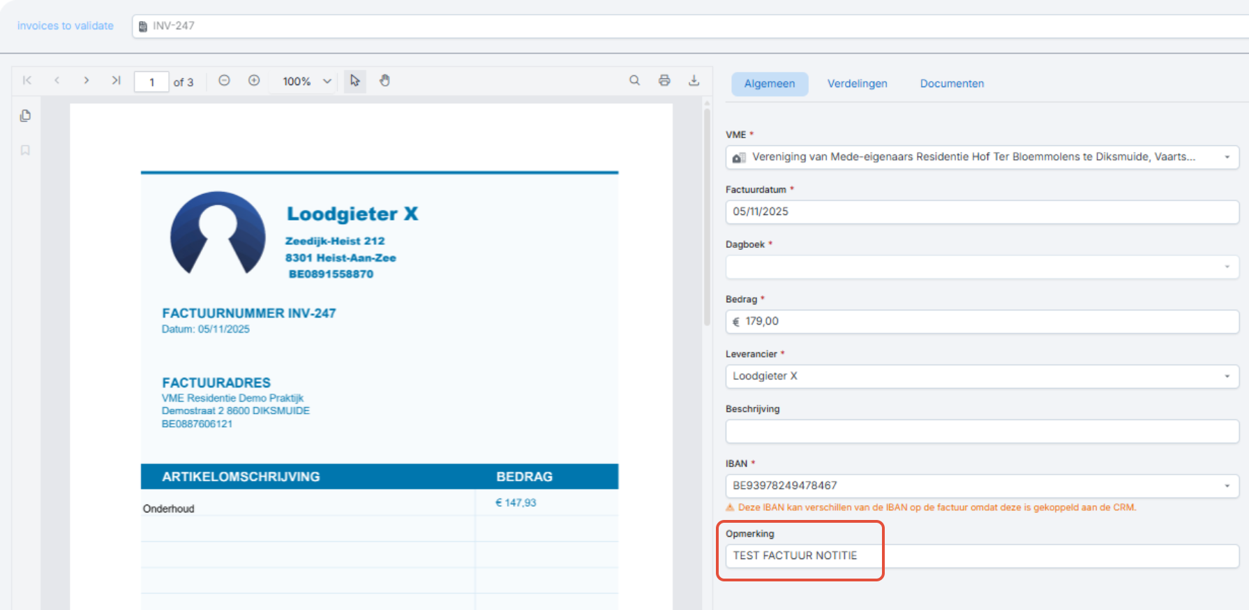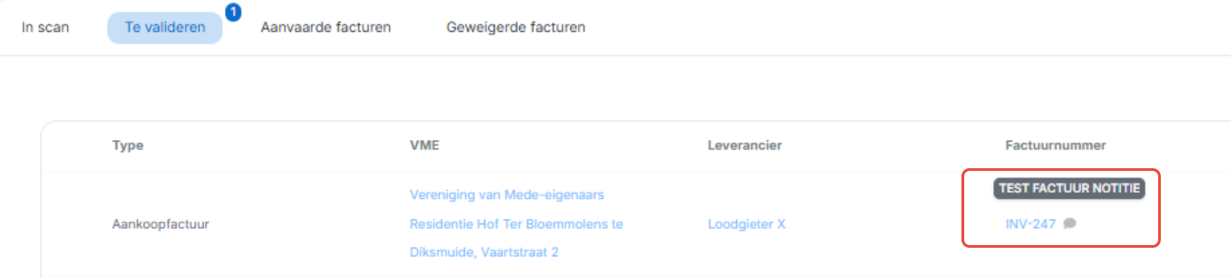 Eens in deze map geplaatst, zal het systeem de factuur uitlezen. Vanaf uitgelezen zal deze zichtbaar zijn bij te valideren facturen met de notitie toegevoegd bij opmerking.