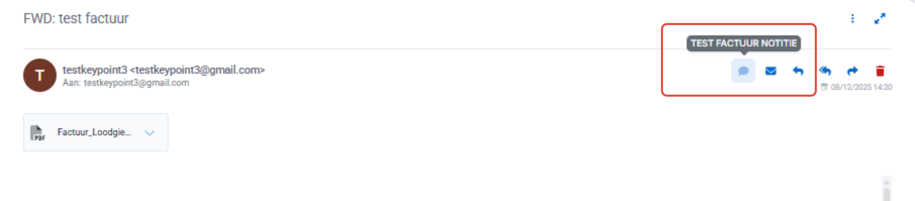 Eens de notitie is toegevoegd aan de factuur, sleept u de mail naar de map waaruit de facturen worden uitgelezen. Dit kan bv. 'Facturen Keypoint' als naam hebben. Zie aankoopfactuur instellingen in de teaminstellingen voor concrete naam.