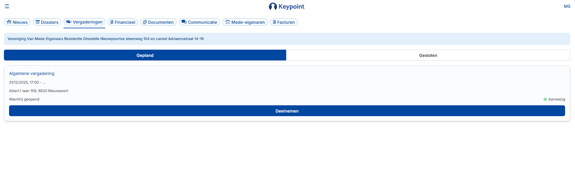 Als uw syndicus de vergadering op het portaal gedeeld heeft zal u op de knop 'deelnemen' kunnen drukken.